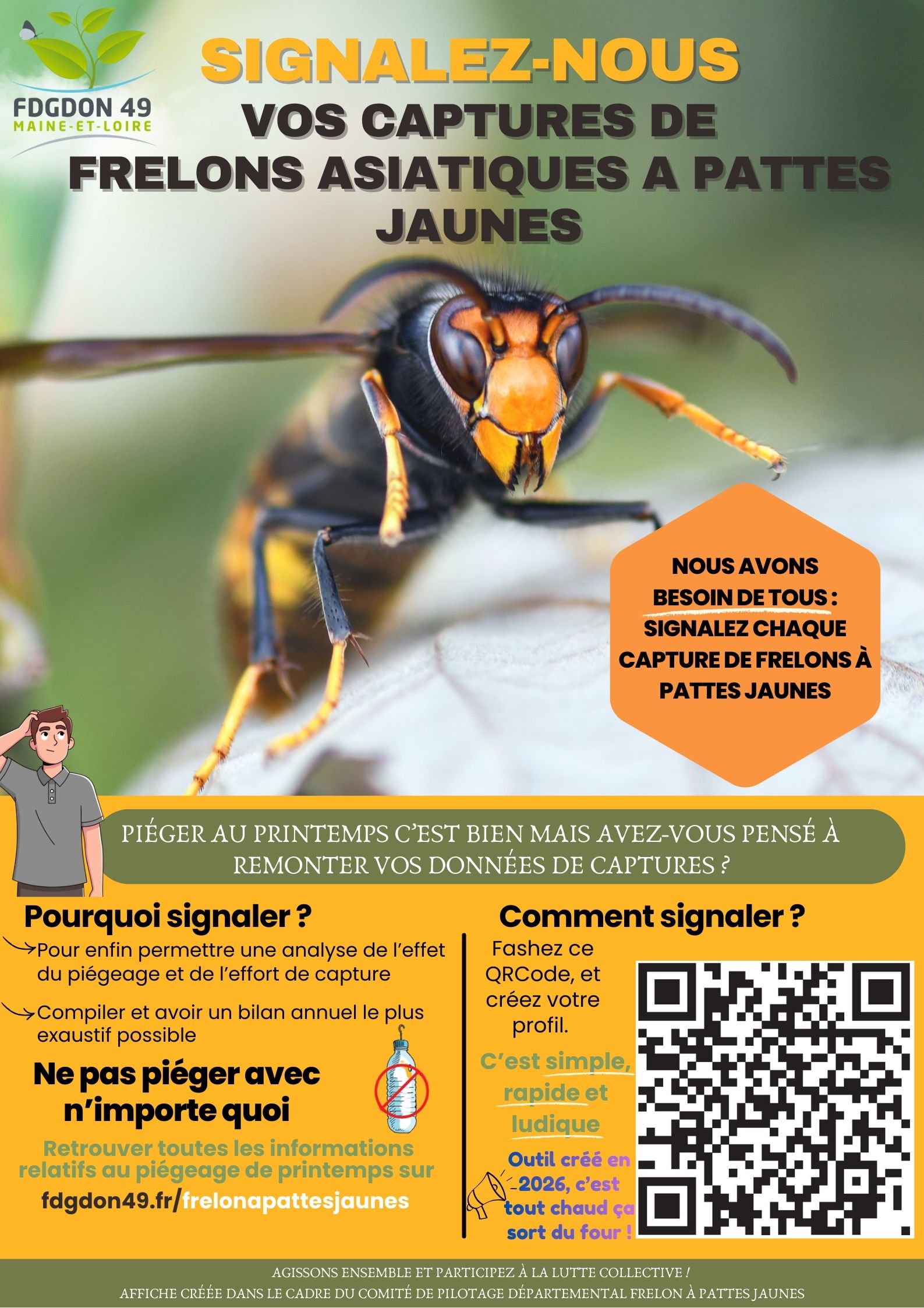 Le piégeage de printemps des fondatrices de frelons à pattes jaunes est coordonné au niveau départemental par la section apicole du GDS (ASAD 49). D’un commun accord, la FDGDON propose le piégeage de printemps pour les GDON et ses communes adhérentes. L’ensemble des données récoltées seront transmises au Comité de Pilotage Départemental, dont l’ASAD fait parti et viendront abonder le bilan départemental.